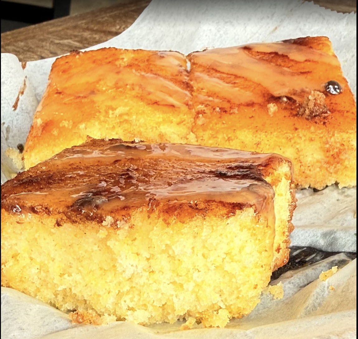 Moist, sweet cornbread baked to golden-brown perfection and topped with rich cinnamon honey butter.