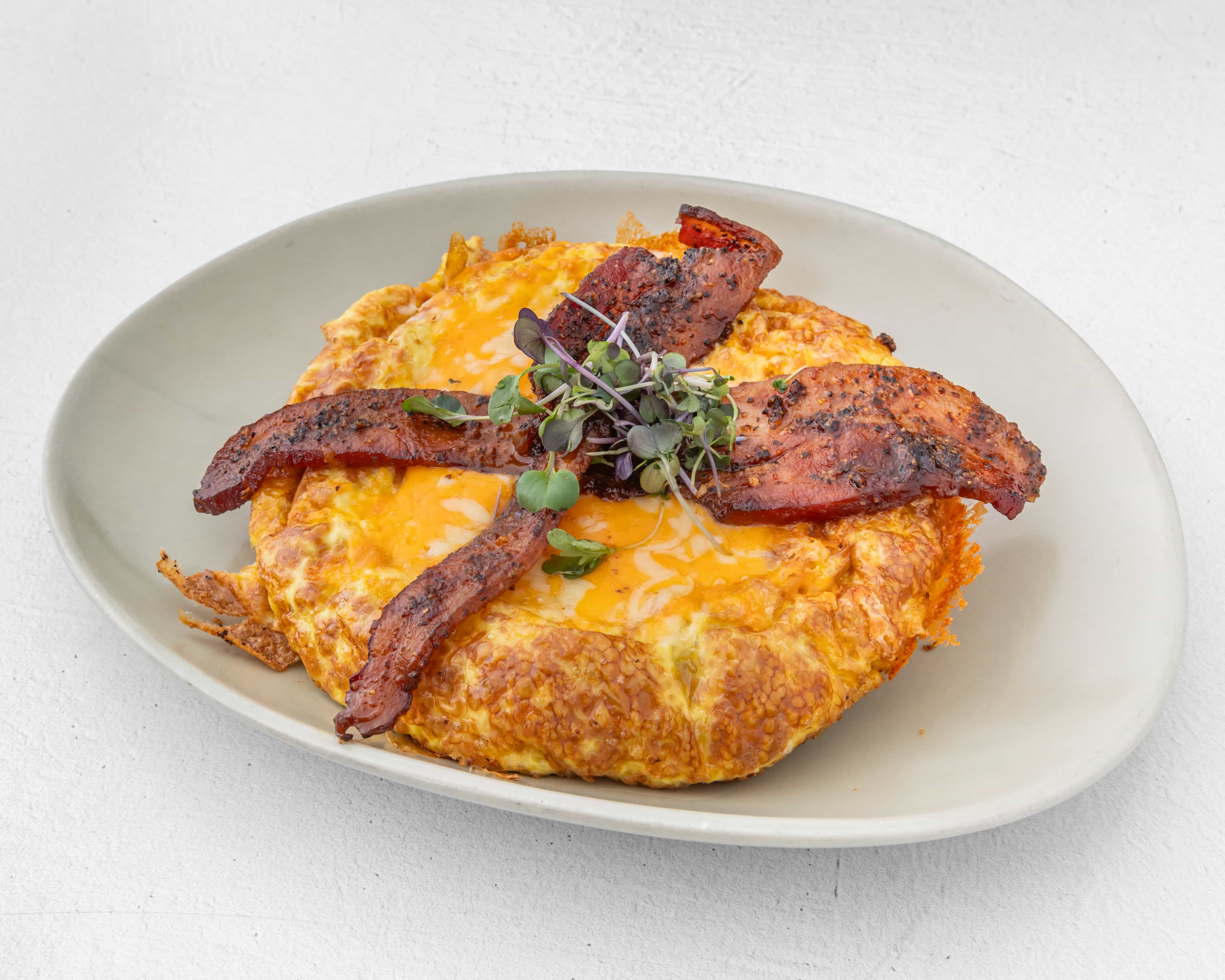 Cornbread waffle, Apple smoked bacon & aged cheddar cheese omelette garnish with millionaire bacon over a house waffle & salted maple syrup.