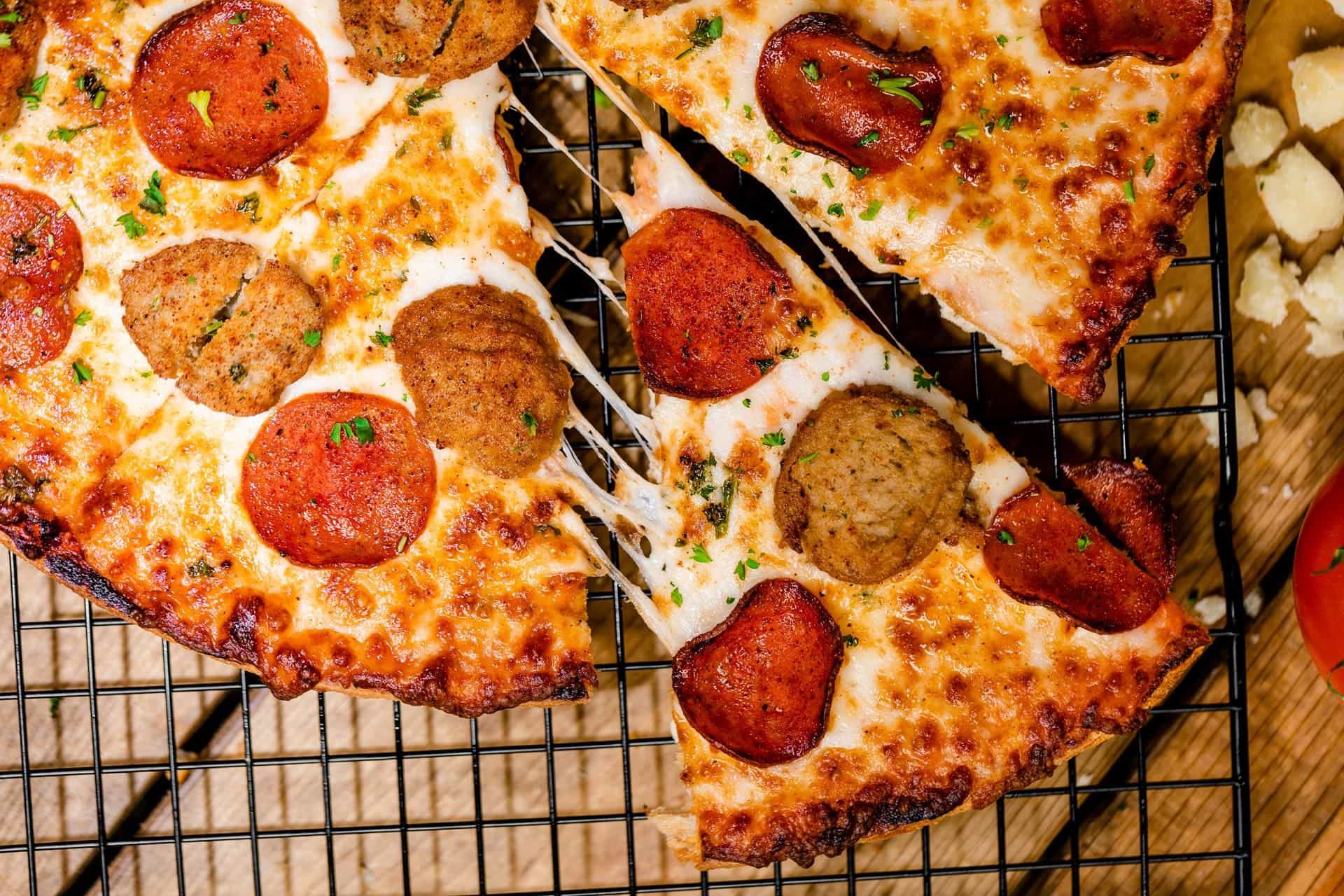 12" Thin crust pizza topped with marinara sauce, mozzarella cheese, turkey pepperoni, and chicken sausage